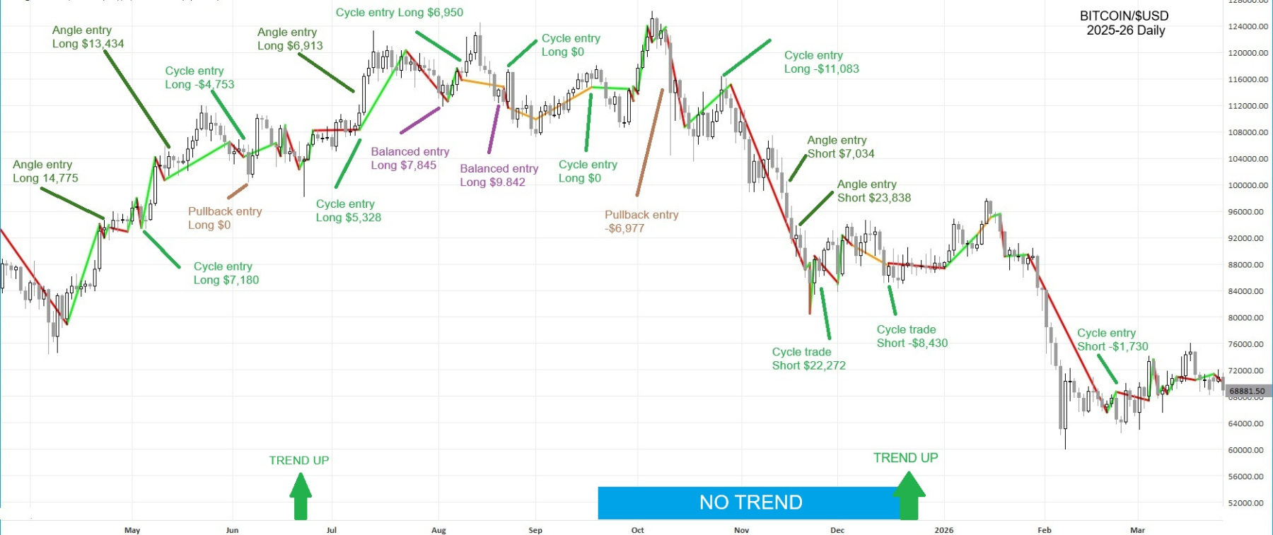 We begin by unveiling the intraday Bitcoin strategy. This approach fuses Gann’s Arcana Trend predictor with his classic intraday periodic cycle—both of which can be calculated in advance using objective mathematical formulas, requiring no hindsight or curve fitting. Layered atop these foundations are Gann’s “balanced entry” technique and his signature geometric angle-based entries.