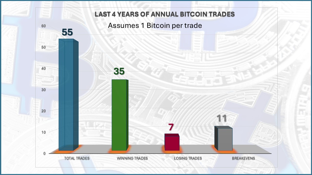 Now check out the trades over the last 4 years using the same process on the annual timeframe and daily chart. This methodology also combined W. D. Gann's Arcana Trend Machine with Gann's Annual Cycle specifically for Bitcoin to identify the correct market phase for buying, selling, or standing aside during the year. Then Gann's trading rules for the daily chart triggered the entries and money management in the applicable phase. The results for all 4 years showed a net profit of $262,627 , assuming 1 Bitcoin per trade and slippage. Click to expand the graph to the left for the rest of the metrics.