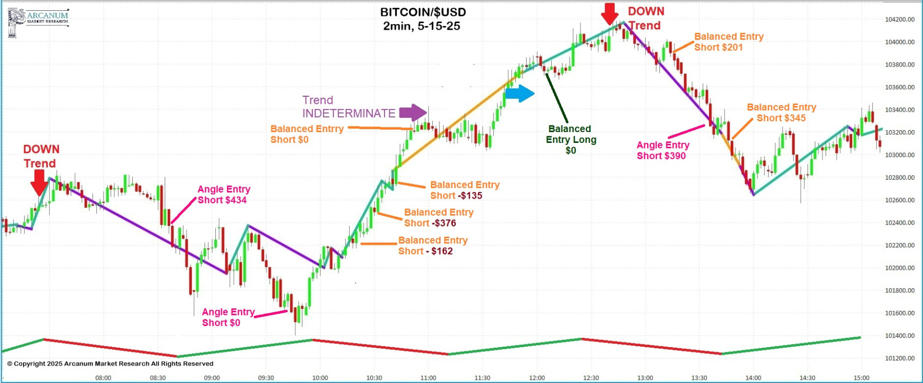 We’re proud to introduce a groundbreaking advancement in modern market application of W.D. Gann’s timeless principles: a fully developed Bitcoin trading strategy grounded in Gann’s original trading methods. This newly completed system is the result of a recent discovery—Gann’s Arcana Trend prediction mechanism, now successfully applied to the Bitcoin market. We begin by unveiling the intraday Bitcoin strategy. This approach fuses Gann’s Arcana Trend predictor with his classic intraday periodic cycle—both of which can be calculated in advance using objective mathematical formulas, requiring no hindsight or curve fitting. Layered atop these foundations are Gann’s “balanced entry” technique and his signature geometric angle-based entries. To further enhance practicality, all trading is confined to U.S. Eastern hours between 9:00am and 4:00pm EST, with all positions closed by day’s end. No overnight risk—just disciplined, daylight-only trading aligned with the natural intraday rhythm of the market. This breakthrough is recent, and we've only had time to do preliminary back testing. For now, we’ve included a snapshot of a 2-minute chart of Bitcoin/USD on April 17, 2025, which was randomly selected from one of our training sessions. This particular Bitcoin instrument seems to display the Law of Vibration with unusual clarity. This intraday Bitcoin Trading Strategy is taught in its entirety in our "W. D. GANN: MASTER THE MARKETS" Training. The strategy only takes trades when both the Arcana Trend and the periodic cycle are in directional agreement. During neutral trend conditions, a proprietary filter activates, allowing trades solely in the direction of the periodic cycle when key criteria are met. All entries include pre-defined targets and stops. The result? Seven trades, all winners, totaling +1,617. Not an uncommon day with this strategy. In the days ahead, we will release our extended back-testing results and roll out additional strategies for intra-week and daily charts, which are currently in beta testing. While price and time projections aren't needed for strategy above, the next step in Gann trading is to put the icing on the cake by narrowing down super-specific price and time entries and targets. See below. Unlike his detailed writings on U.S. Indexes and metals, Gann left no direct instructions for Bitcoin. Unlocking the dominant cycles took over seven years of intensive research. But now, the breakthrough is here.</P