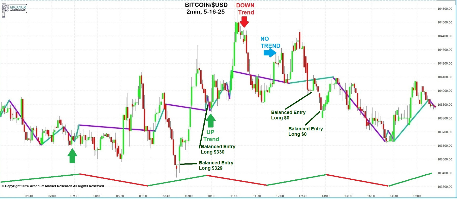 We’re proud to introduce a groundbreaking advancement in modern market application of W.D. Gann’s timeless principles: a fully developed Bitcoin trading strategy grounded in Gann’s original trading methods. This newly completed system is the result of a recent discovery—Gann’s Arcana Trend prediction mechanism, now successfully applied to the Bitcoin market. We begin by unveiling the intraday Bitcoin strategy. This approach fuses Gann’s Arcana Trend predictor with his classic intraday periodic cycle—both of which can be calculated in advance using objective mathematical formulas, requiring no hindsight or curve fitting. Layered atop these foundations are Gann’s “balanced entry” technique and his signature geometric angle-based entries. To further enhance practicality, all trading is confined to U.S. Eastern hours between 9:00am and 4:00pm EST, with all positions closed by day’s end. No overnight risk—just disciplined, daylight-only trading aligned with the natural intraday rhythm of the market. This breakthrough is recent, and we've only had time to do preliminary back testing. For now, we’ve included a snapshot of a 2-minute chart of Bitcoin/USD on April 17, 2025, which was randomly selected from one of our training sessions. This particular Bitcoin instrument seems to display the Law of Vibration with unusual clarity. This intraday Bitcoin Trading Strategy is taught in its entirety in our "W. D. GANN: MASTER THE MARKETS" Training. The strategy only takes trades when both the Arcana Trend and the periodic cycle are in directional agreement. During neutral trend conditions, a proprietary filter activates, allowing trades solely in the direction of the periodic cycle when key criteria are met. All entries include pre-defined targets and stops. The result? Seven trades, all winners, totaling +1,617. Not an uncommon day with this strategy. In the days ahead, we will release our extended back-testing results and roll out additional strategies for intra-week and daily charts, which are currently in beta testing. While price and time projections aren't needed for strategy above, the next step in Gann trading is to put the icing on the cake by narrowing down super-specific price and time entries and targets. See below. Unlike his detailed writings on U.S. Indexes and metals, Gann left no direct instructions for Bitcoin. Unlocking the dominant cycles took over seven years of intensive research. But now, the breakthrough is here.</P