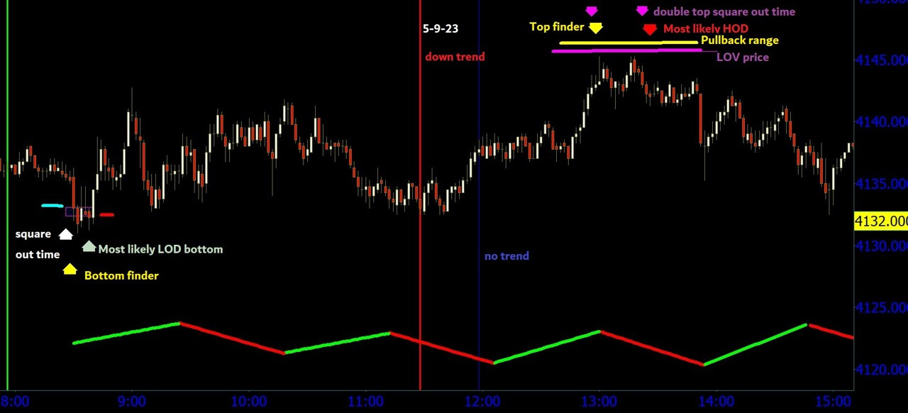 Let's describe what you are looking at. First, notice the context of the predictions on each day. The vertical red and green lines denotes predicted trend until the next vertical line (green up, red down). Blue denotes trend neutral. The UP/DOWN cycle at the bottom is the periodic cycle, which is drawn in advance of market data as well. So ideally, the Gann practitioner will acts on the price and time predictions in harmony with the trend and cycle direction at the time.