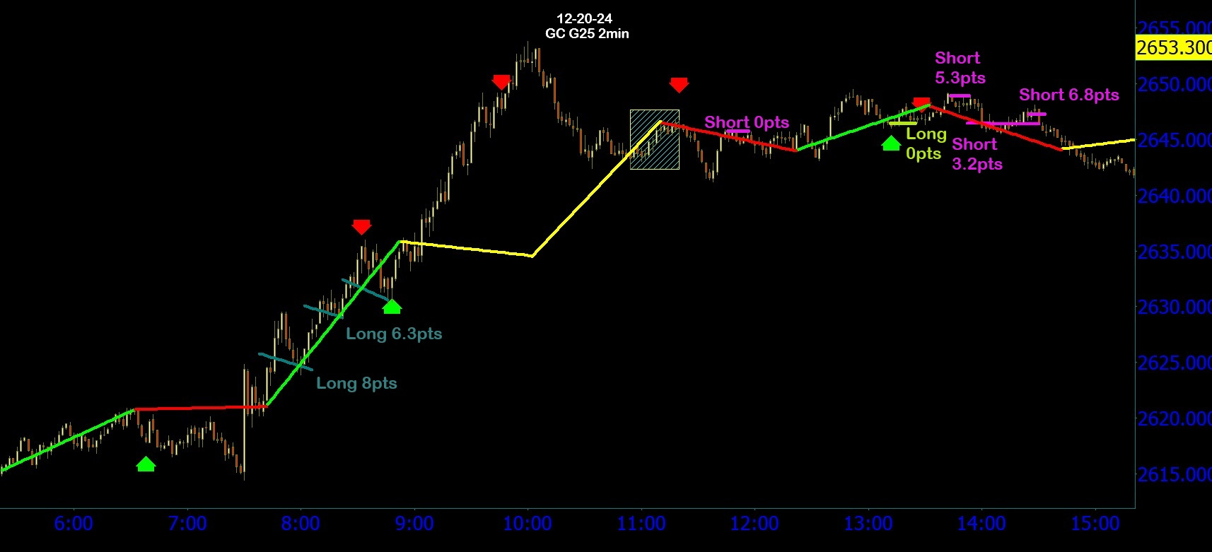 Below are just a few of the trading strategies of W. D. Gann applied to the modern gold futures market. Gann wrote about gold trading in his "Silver Springs" chapter of 'The Tunnel Thru The Air.'Gann's classic trading methods also work amazing on gold. Integrating the Silver Springs cycle with Gann's "Arcana" Trend Cycle, we get the foundation for one of Gann's classic trading strategies. We call it "Goldfinger." Goldfinger Daily combines the Silver Springs/Arcana foundation with classic Gann trading rules, like his Angle and Balanced Entry Methods. You can read more about the individual Arcana Trend Cycles and Silver Springs Metal Trading Cycle. These strategies are taught in their entirety in our "W. D. Gann: Master The Markets" Training. Scroll through and expand the gallery below to see every trade generated from Goldfinger for Gold daily for the years 2022- 2024. When we first posted this gold trading strategy, we received a ton of emails and inquiries. Many of you asked if we could upload white charts instead of black, and show the interplay between the Arcana trend forecast and Silver Springs Cycle on the chart. The charts above do all that and more. We also tested a slightly cleaner version of Goldfinger that produces more profit on less trades. In the above galleries, Goldfinger II generated 24 trades over the last 3 years on the Gold Daily Chart. Only 3 of these trades ended in losses, 3 were breakevens, and the rest were winners. This adds up to an outlandish 2,204 points assuming each trade entered only 1 contract! That's over 200 points more than Goldfinger I with 3 less trades. There are more Gann daily gold trading strategies than Goldfinger. Scroll through and expand the gallery below for our daily Polarity Line Trades on gold for the years 2022- 2023. Both Goldfinger and the Polarity Lines can be traded simultaneously. Between 2022 through 2024, there were 11 trades generated. All of them were sins except for 3 slippage losses of less than 5 points each. If you took these trades as well, you would have added an additional 265 points on gold over the last 3 years assuming 1 contract per trade. Does Goldfinger work on other timeframes with gold? Why, yes it does. On intraday trading, Goldfinger combines the intraday Arcana Trend Cycle with the Periodic Cycle for gold. This cycle changes every day, but is generated from a fixed point using a mathematical formula before the market data. Right now, we have this strategy worked out beginning with the old COMEX pit start time of 8:20am EST in the US Session. As you scroll through and expand the gallery below, we took several consecutive days (minus a FED day and the day thereafter which we never trade) near the end of 2024. Despite this being a less-than-ideal time of the year to trade, take a look at the results. The green and red arrows represent the Arcana Trend Cycle. These represent W. D. Gann's trend that he advised never to buck. The up and down green and red lines represent the periodic cycle for that day. Both of these are drawn out in advance of market data. Gann's unique trading rules change based on the interaction of these two cycles. Out of the 8 days we looked at, Goldfinger generated 51 trades. 35 were wins, 6 losses, and the rest were break-evens. As also is the case with the daily, the strategy generates targets, stops, and move-stop-to-breakeven signals for every trade. At the end of every day (4pm EST) you are flat. Intraday Goldfinger is also included in our "W. D. Gann: Master The Markets" Training. In the gallery below, the intraday Arcana Trend Cycle is combined with intraday polarity lines. Both are drawn before the market data . These lines shows the hidden breakout/down price behind the scenes of the market. Trades are only taken in direction of the Arcana Trend Cycle. The red and green vertical lines represent trend direction predicted ahead of the market. Red is down, green is up. You will also notice that there are some times/zones where there is no trend (shaded box) or the trend is indeterminate. W. D. Gann intended these zones to act as trade direction filters, only trading in the predicted direction of the trend. The horizontal lines you see are 'polarity," or breakout/down lines which act as entry triggers if price closes above or below them. Our trading session starts at the old pit time of 8:20am Eastern US time. The big white arrows denote trades. By combining these two rule-based methods, we get a system that is entirely objective and rule-based that can be back-tested. The little blue arrows denote predicted ideal times for entries in the direction of the trend in case of a pullback against the trend. The little purple arrows denote ideal times for a market run in the direction of the trend to end or pause. They are not “buy on blue sell on purple” signals.