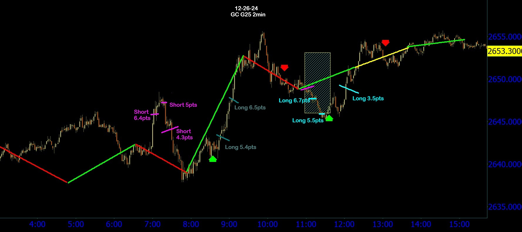 Below are just a few of the trading strategies of W. D. Gann applied to the modern gold futures market. Gann wrote about gold trading in his "Silver Springs" chapter of 'The Tunnel Thru The Air.'Gann's classic trading methods also work amazing on gold. Integrating the Silver Springs cycle with Gann's "Arcana" Trend Cycle, we get the foundation for one of Gann's classic trading strategies. We call it "Goldfinger." Goldfinger Daily combines the Silver Springs/Arcana foundation with classic Gann trading rules, like his Angle and Balanced Entry Methods. You can read more about the individual Arcana Trend Cycles and Silver Springs Metal Trading Cycle. These strategies are taught in their entirety in our "W. D. Gann: Master The Markets" Training. Scroll through and expand the gallery below to see every trade generated from Goldfinger for Gold daily for the years 2022- 2024. When we first posted this gold trading strategy, we received a ton of emails and inquiries. Many of you asked if we could upload white charts instead of black, and show the interplay between the Arcana trend forecast and Silver Springs Cycle on the chart. The charts above do all that and more. We also tested a slightly cleaner version of Goldfinger that produces more profit on less trades. In the above galleries, Goldfinger II generated 24 trades over the last 3 years on the Gold Daily Chart. Only 3 of these trades ended in losses, 3 were breakevens, and the rest were winners. This adds up to an outlandish 2,204 points assuming each trade entered only 1 contract! That's over 200 points more than Goldfinger I with 3 less trades. There are more Gann daily gold trading strategies than Goldfinger. Scroll through and expand the gallery below for our daily Polarity Line Trades on gold for the years 2022- 2023. Both Goldfinger and the Polarity Lines can be traded simultaneously. Between 2022 through 2024, there were 11 trades generated. All of them were sins except for 3 slippage losses of less than 5 points each. If you took these trades as well, you would have added an additional 265 points on gold over the last 3 years assuming 1 contract per trade. Does Goldfinger work on other timeframes with gold? Why, yes it does. On intraday trading, Goldfinger combines the intraday Arcana Trend Cycle with the Periodic Cycle for gold. This cycle changes every day, but is generated from a fixed point using a mathematical formula before the market data. Right now, we have this strategy worked out beginning with the old COMEX pit start time of 8:20am EST in the US Session. As you scroll through and expand the gallery below, we took several consecutive days (minus a FED day and the day thereafter which we never trade) near the end of 2024. Despite this being a less-than-ideal time of the year to trade, take a look at the results. The green and red arrows represent the Arcana Trend Cycle. These represent W. D. Gann's trend that he advised never to buck. The up and down green and red lines represent the periodic cycle for that day. Both of these are drawn out in advance of market data. Gann's unique trading rules change based on the interaction of these two cycles. Out of the 8 days we looked at, Goldfinger generated 51 trades. 35 were wins, 6 losses, and the rest were break-evens. As also is the case with the daily, the strategy generates targets, stops, and move-stop-to-breakeven signals for every trade. At the end of every day (4pm EST) you are flat. Intraday Goldfinger is also included in our "W. D. Gann: Master The Markets" Training. In the gallery below, the intraday Arcana Trend Cycle is combined with intraday polarity lines. Both are drawn before the market data . These lines shows the hidden breakout/down price behind the scenes of the market. Trades are only taken in direction of the Arcana Trend Cycle. The red and green vertical lines represent trend direction predicted ahead of the market. Red is down, green is up. You will also notice that there are some times/zones where there is no trend (shaded box) or the trend is indeterminate. W. D. Gann intended these zones to act as trade direction filters, only trading in the predicted direction of the trend. The horizontal lines you see are 'polarity," or breakout/down lines which act as entry triggers if price closes above or below them. Our trading session starts at the old pit time of 8:20am Eastern US time. The big white arrows denote trades. By combining these two rule-based methods, we get a system that is entirely objective and rule-based that can be back-tested. The little blue arrows denote predicted ideal times for entries in the direction of the trend in case of a pullback against the trend. The little purple arrows denote ideal times for a market run in the direction of the trend to end or pause. They are not “buy on blue sell on purple” signals.