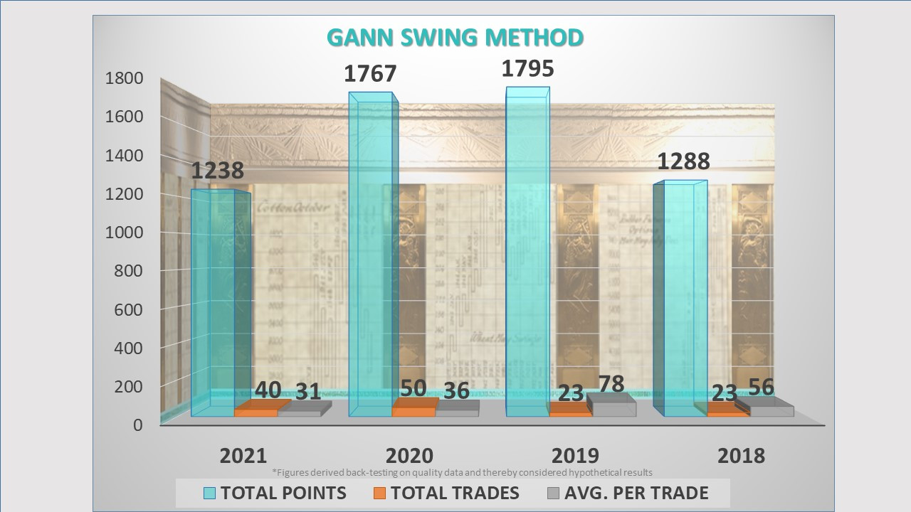 We keep trade diaries for the Gann Swing Method going back 7 years now. Please contact us for more stats, including number of wins vs. losses, largest win, largest loss, etc.