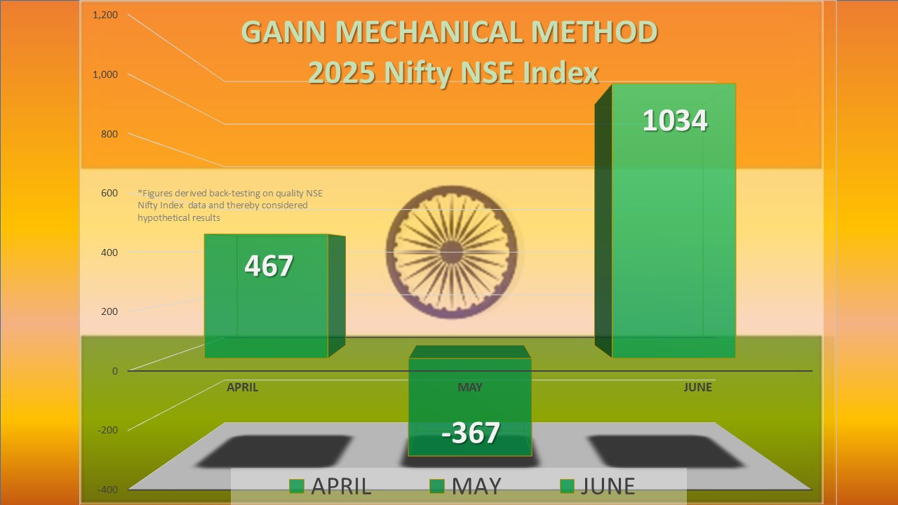 See the graphs on this page for how W. D. Gann’s Mechanical Method performs on the Nifty 50 Indian Equities Index over the last few years. These results were obtained using the Nifty Index confined to the regular Indian trading session for the indexes and can be traded using the Nifty futures or synthetics.